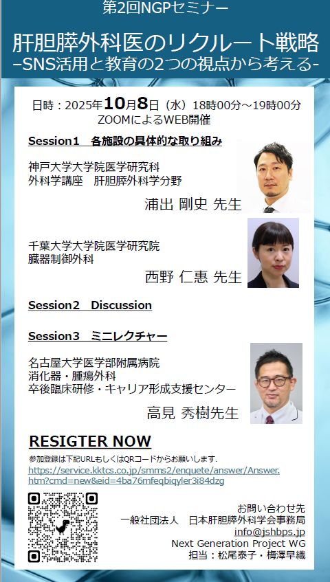 このたび、第2回NGPセミナーを下記のとおり開催いたします。今回は「リクルート戦略」をテーマに掲げ、各施設での取り組みの紹介に加え、SNSの活用や教育の視点から、肝胆膵外科医の魅力発信について幅広く議論したいと考えています。